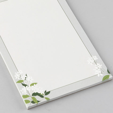 A white jasmine garden on a classic light grey lends a subtle tone to this notepad for writing everyday notes